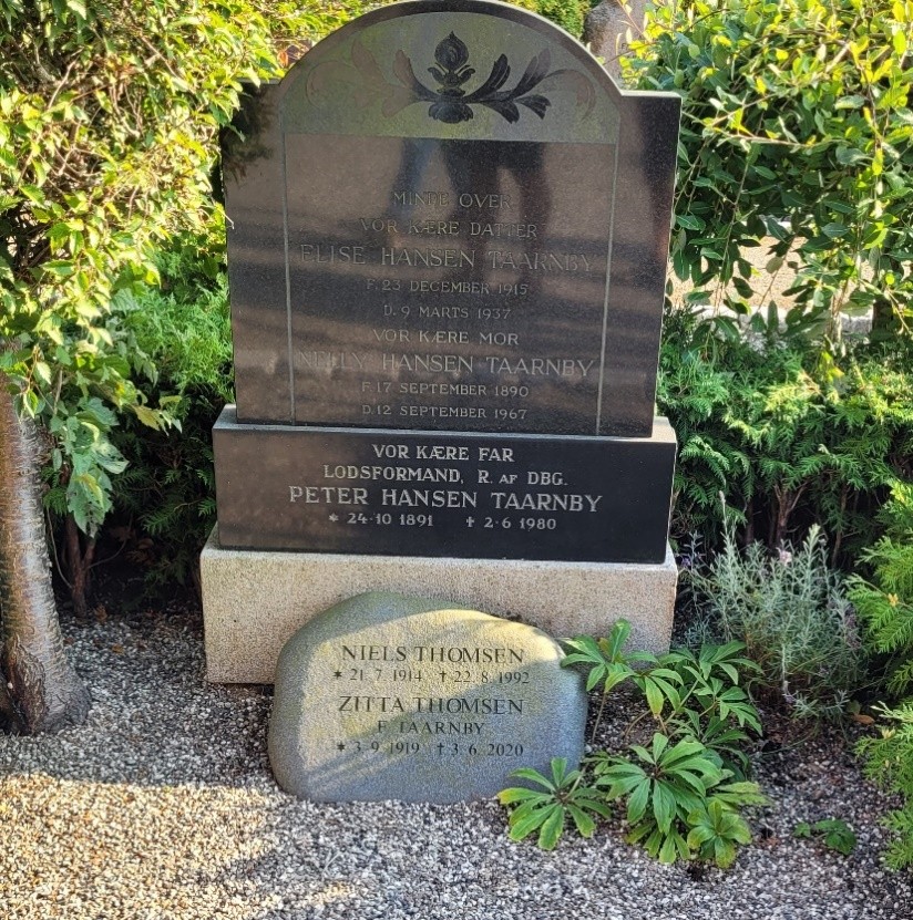 På soklen: Vor kære far/ Lodsformand, R af DBG/ Peter Hansen Taarnby/ født 24. oktober 1891/ død den 2. juni 1980.