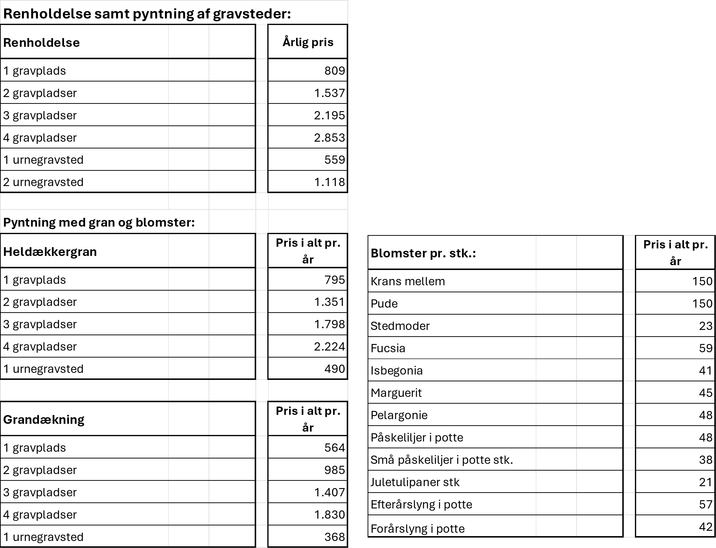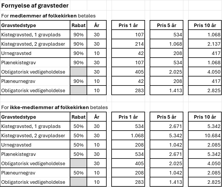 På nedenstående oversigt kan du finde priser for køb af kirkegårdsydelser såsom køb af gravsted, vedligehold og årstidens blomster. Der er også priser for forlængelse af gravsteder når de udløber.